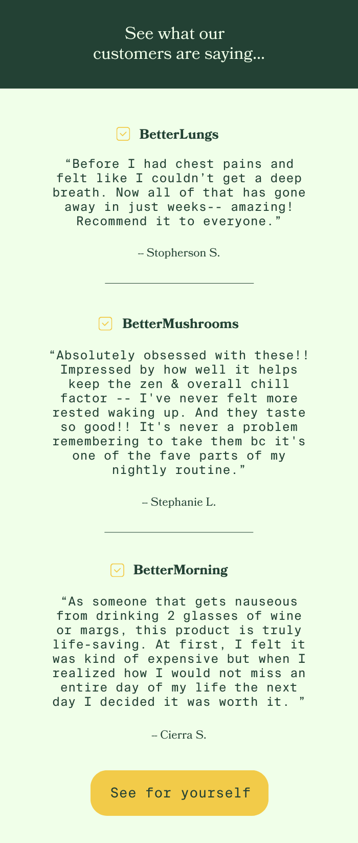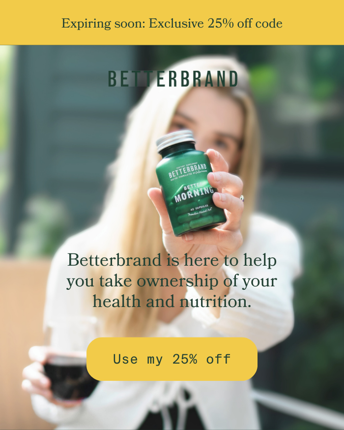 Let us help you experience better health. It's time to take back control of your life, and feel more balanced, fulfilled, and empowered with our highly-absorbable, and quick-impact, natural ingredients. Due to the nature of our natural, filler-free ingredients, try Betterbrand for at least 30 days to experience our supplements' full effect. No longer want to receive these emails? Betterbrand. PO Box 12363, San Antonio, TX 78212