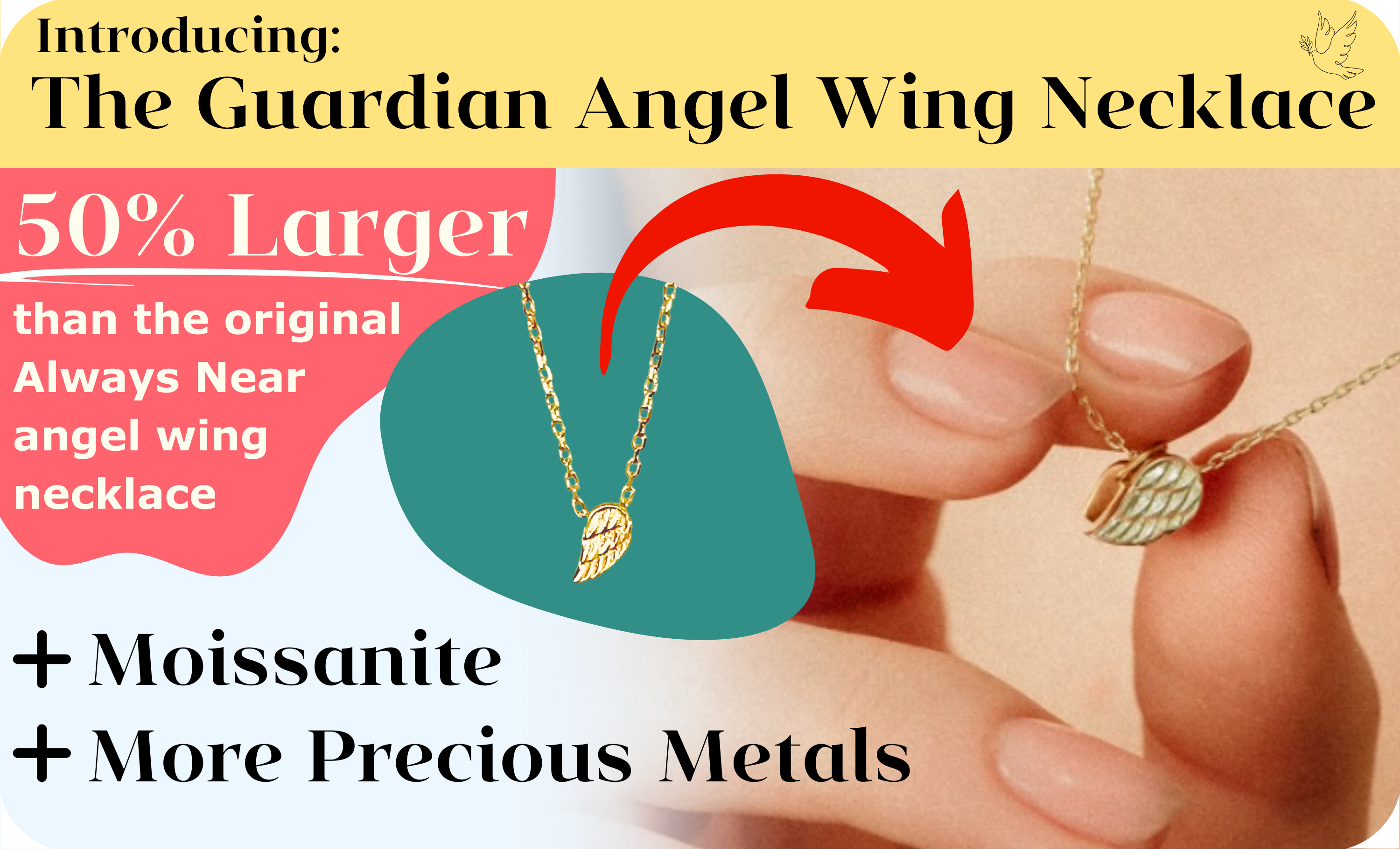 -Bigger than the small, dainty "Always Near" angel wing necklace. -Our first piece featuring Moissanite, a remarkably tough and bright precious stone. -Made with more precious metals than any other piece we carry. Commemorate those who have gone before you with our New Special Edition necklace.