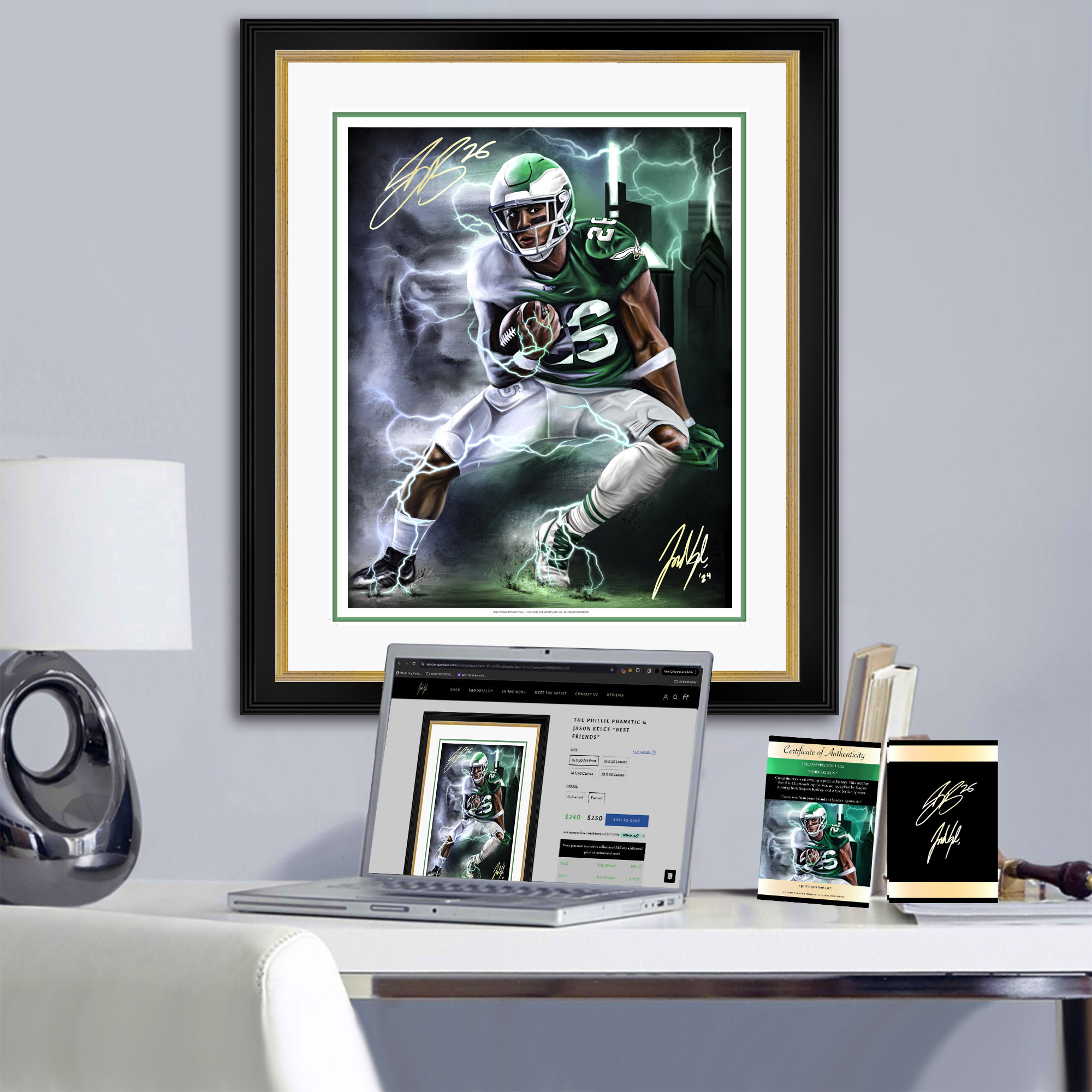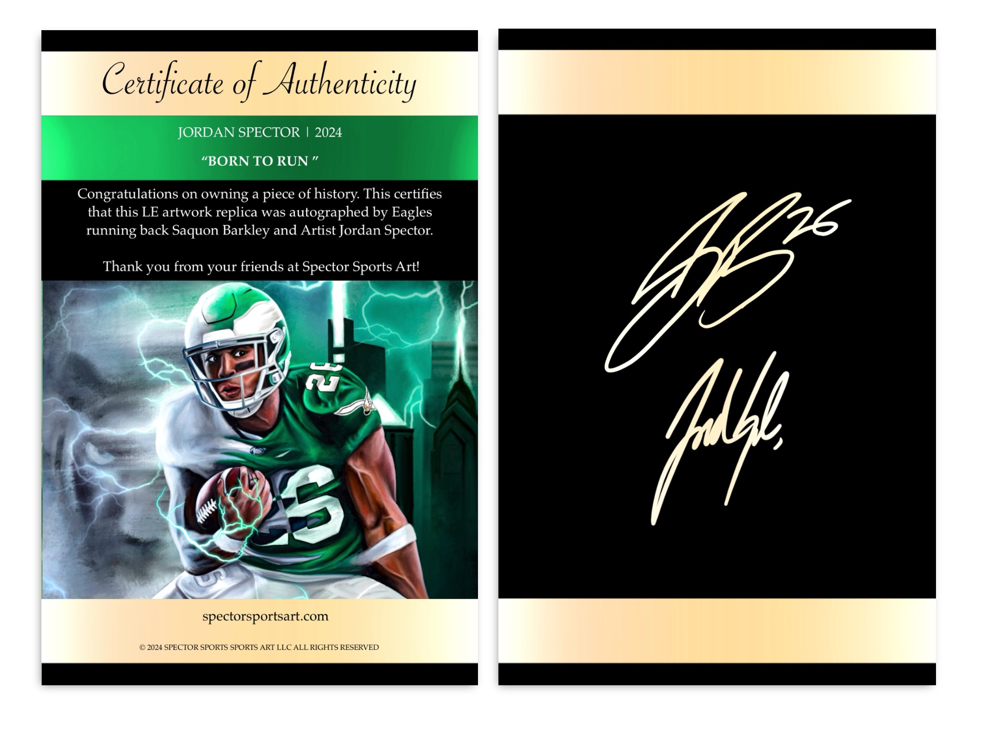 "BORN TO RUN" ARTIST X ATHLETE DUAL AUTOGRAPH OPPORTUNITY | | WELCOME HOME Who would've thought, Saquon Barkley, a Philadelphia Eagle! Since his Penn State days, I've been a big fan. Even as a Giants player, I couldn't help but root for him despite being an Eagles fan. Now, with one of the best offensive lines, Saquon is poised to become the running back he's destined to be. In Happy Valley, he's a legend, and I can't wait to see that happen in Philadelphia. The Kelly Green uniform suits him perfectly. This piece captures Saquon's journey from Penn State to the Eagles. Look closely: on the left, a lion hides in the smoke with Saquon in his all-white Penn State uniform. Now, he's in Kelly Green with the Philadelphia skyline, performing his signature juke. The electricity throughout represents the energy Saquon brings to the field. On top of this release we also have the rare opportunity to get these autographed by the man himself. Here are the details! ARTIST X ATHLETE Saquon Barkley Autograph Jordan Spector Autograph 1st edition numbered JSA COA Spector Sports Art COA PRE ORDER ENDS 5/31 11:59 PM ALL NON AUTOGRAPH ORDERS AND AUTOGRAPH ORDERS BEGIN SHIPPING WEEK OF JUNE 10TH. AVAILABLE NOW! - Jordan | The Spector Sports Art Team | @spector_art | | No longer want to receive these emails? Unsubscribe. Spector Sports Art LLC | | | | |