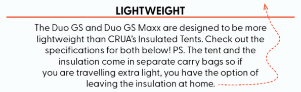 Hi , PACKED WITH AWESOME FEATURES The Duo GS is packed with features making it a high quality and durable tent that provides unrivalled comfort for backpackers, wild campers and adventure seekers in any conditions. We're pretty smug about how it turned out! Waterproof Made from high-quality material with a HH rating of up to 5000mm. This tent will keep you dry in the heaviest of rain showers. Durable Construction High-quality construction ensures long-term value and peace of mind in all seasons and weather conditions. 2 Year Warranty All CRUA Products come with a limited 2 year warranty! So if anything goes wrong, we've got you covered.