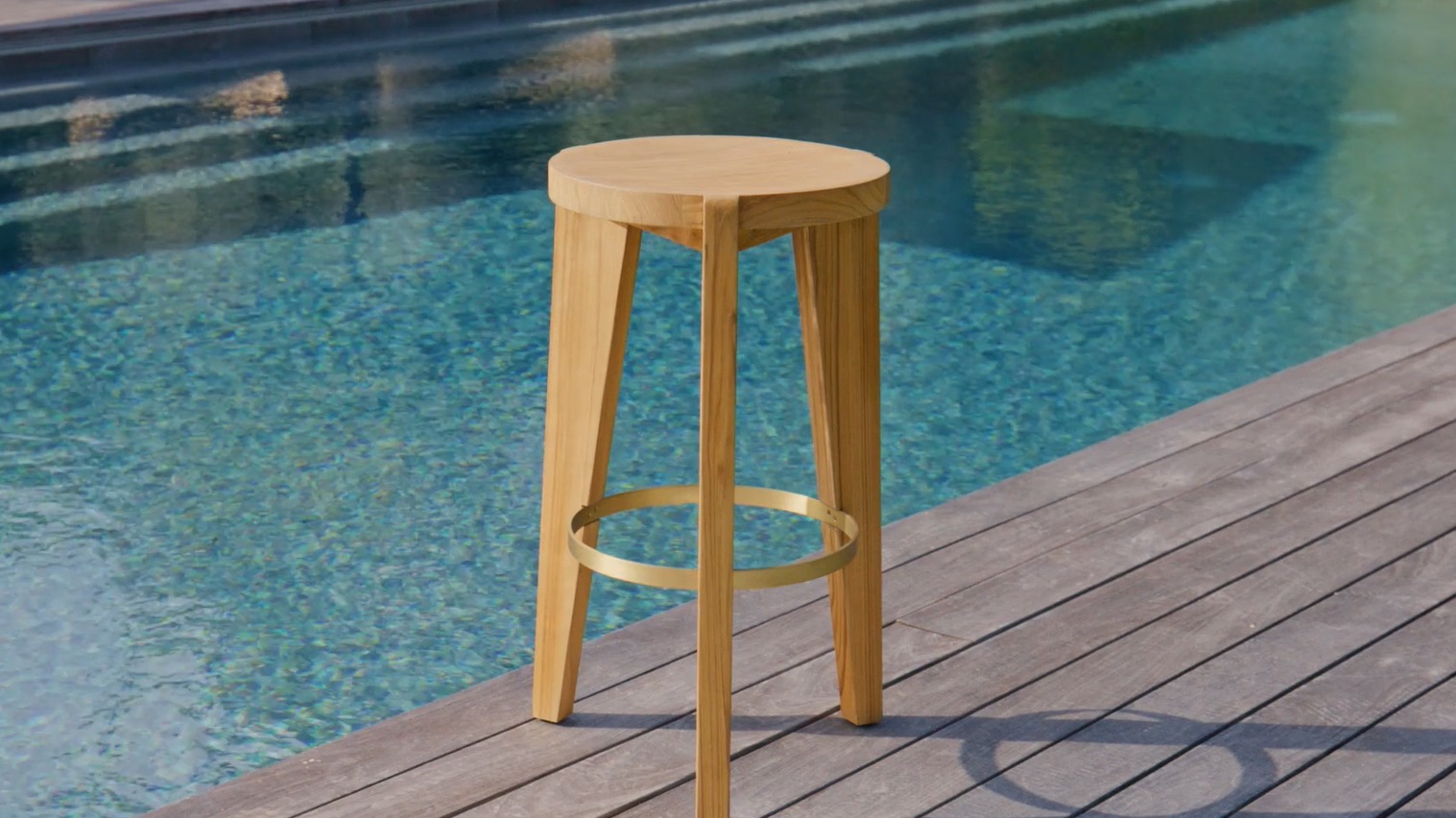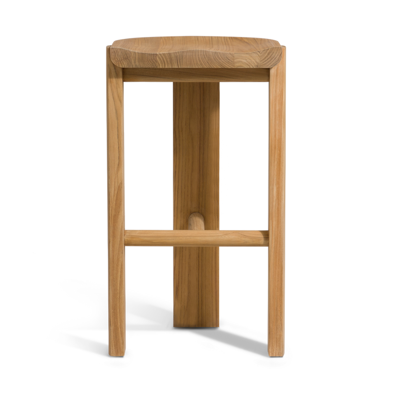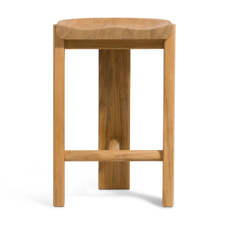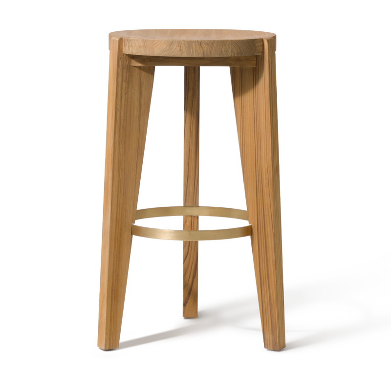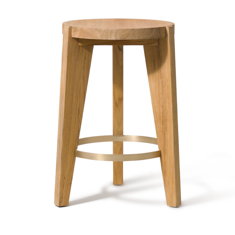 A contemporary update to French midcentury shapes, the tripod construction of our new Bari Collection creates a beautiful play of negative space to keep other pieces in conversation. Enjoy an artfully crafted solid sealed Teak frame in Natural with hints of brass accents. Built for outdoor entertaining, this outdoor counter stool injects a pop of style in any space. | | | | |