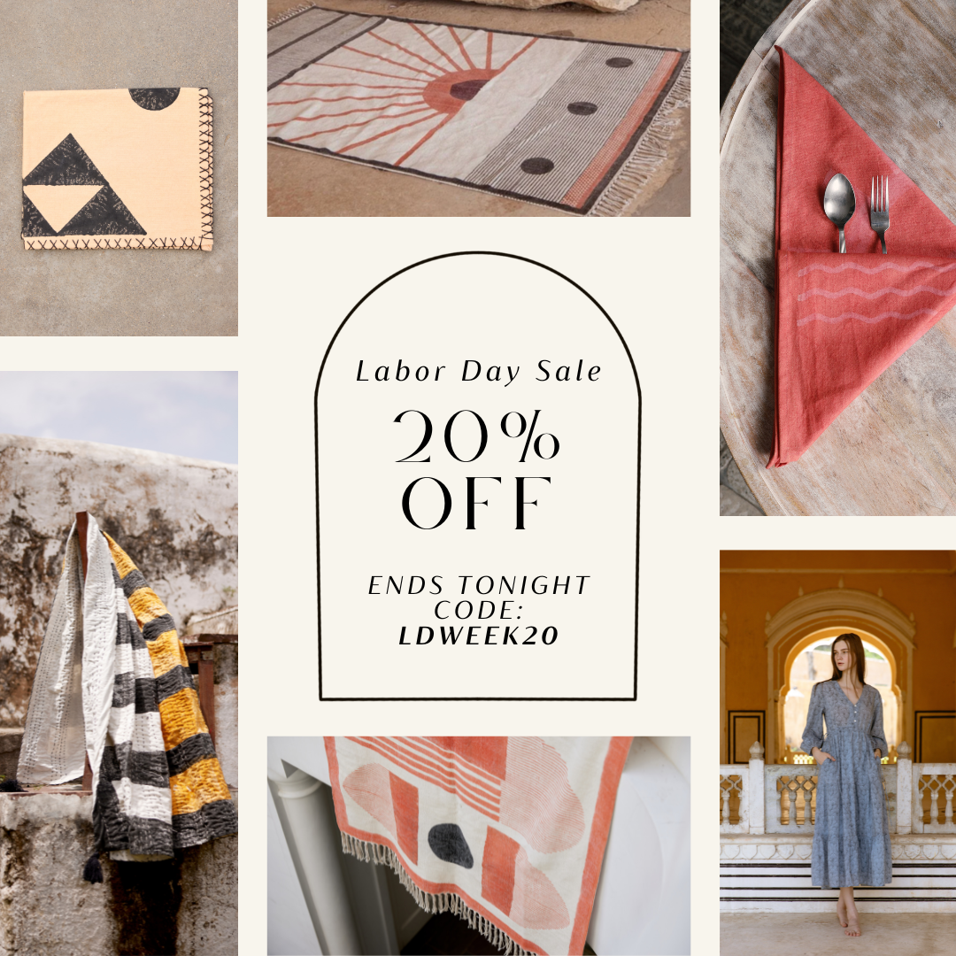 Hurry, time's running out – our Labor Day Sale ends tonight! Don't miss out on 20% OFF all rugs, throws, pillows, and clothing. Use code LDWEEK20 at checkout before midnight. | | As always, each clothing item you purchase provides a meal to a child in India. We deeply appreciate your support as we work together to fight child hunger, one step at a time. | | | | |