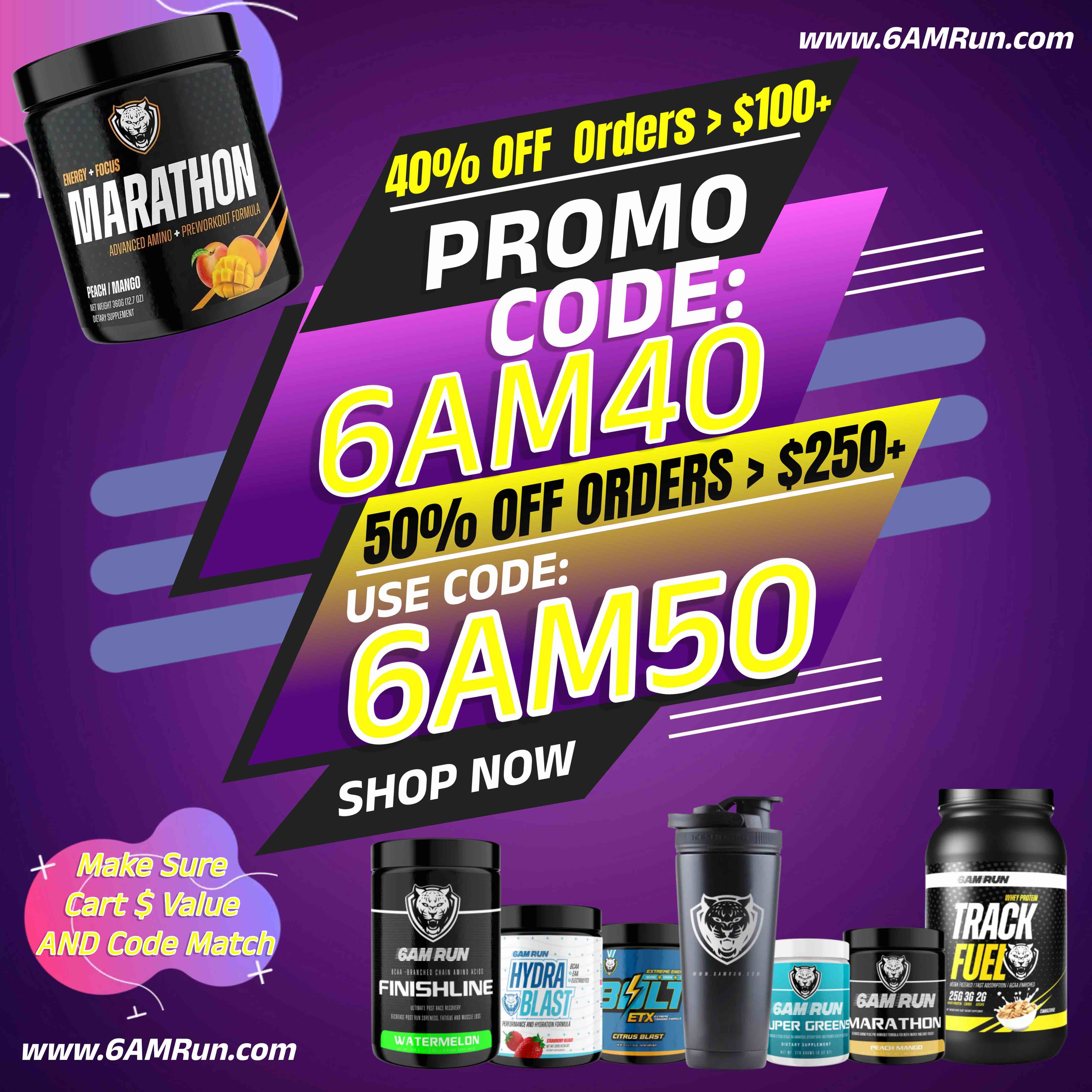 Hi there, One of the data points you see when you are a retail product/brand is customers who are keeping an eye on products but yet to buy. So we wanted to reach out again, and make an offer that has NEVER been done. 50% OFF (any order/cart value of $250+) @ 6AMRun.com. So a Cart Value of $250, is now $125!!! We do offer other daily deals like FREE SAMPLES, Free Shipping & More! Plus we offer a 125% Money Back Guarantee on Results, AND TASTE.. But.. That wasn't enough we guess?? Today we said lets give our next 6AM Runners a SMALL couple hour window & let's UP IT! How about 40% OFF??? or WAIT, THERE IS MORE, lol.. HOW ABOUT 50% OFF??? Yup, add $100+ dollars of 6AMRun.com products to your Checkout Cart and type PROMO CODE: 6AM40 during checkout for 40% OFF! OR.. Add $250+ dollars of 6AMRun.com products to your Checkout Cart and type PROMO CODE: 6AM50 during checkout for 50% OFF! Again, thank you for considering 6AMRun.com and our game-changing formulas! *Don't forget $75+ dollars qualify for FREE SHIPPING! Best regards, 6AM Run Team 6AMRun.com | | | | |