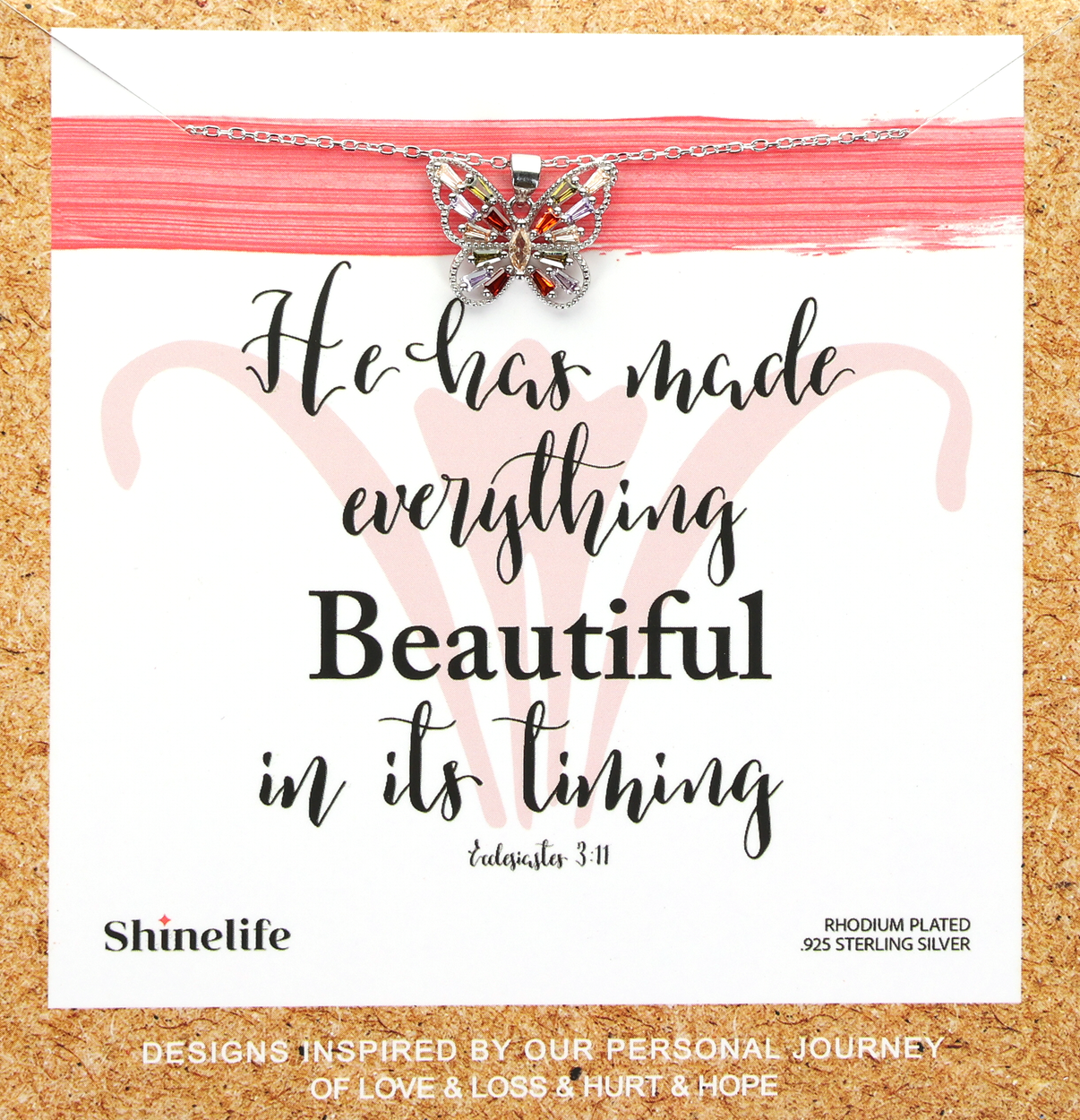 Beautiful In Its Timing Butterfly Necklace Life can be so hard at times, but we can trust God that His timing is always best. He has made everything beautiful in its timing. Ecclesiastes 3:11 says, "He has made everything beautiful in its time. He has also set eternity in the human heart; yet no one can fathom what God has done from beginning to end." | | | | |