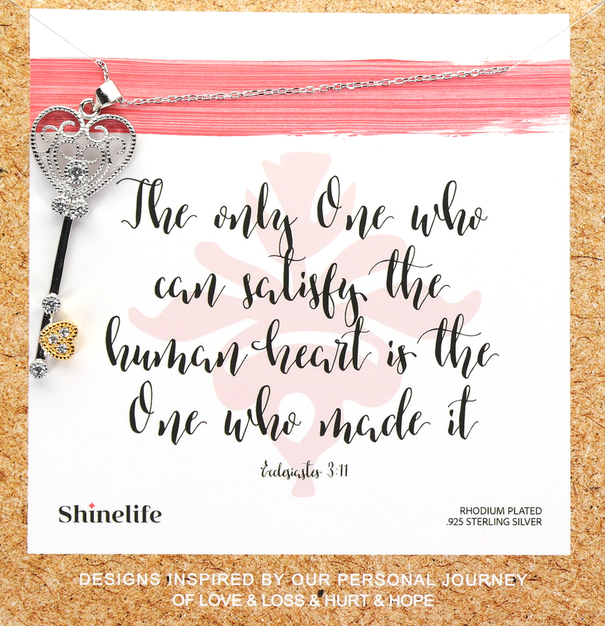 The Key to the Heart Necklace This necklace is a reminder that nothing in this world can truly satisfy the human heart except the one you created it. It is God that can satisfy our longings and give us true peace. In Ecclesiastes 3:11, it says "He has made everything beautiful in its time. He has also set eternity in the human heart: yet no one can fathom what God has done from beginning to end." | | | | |