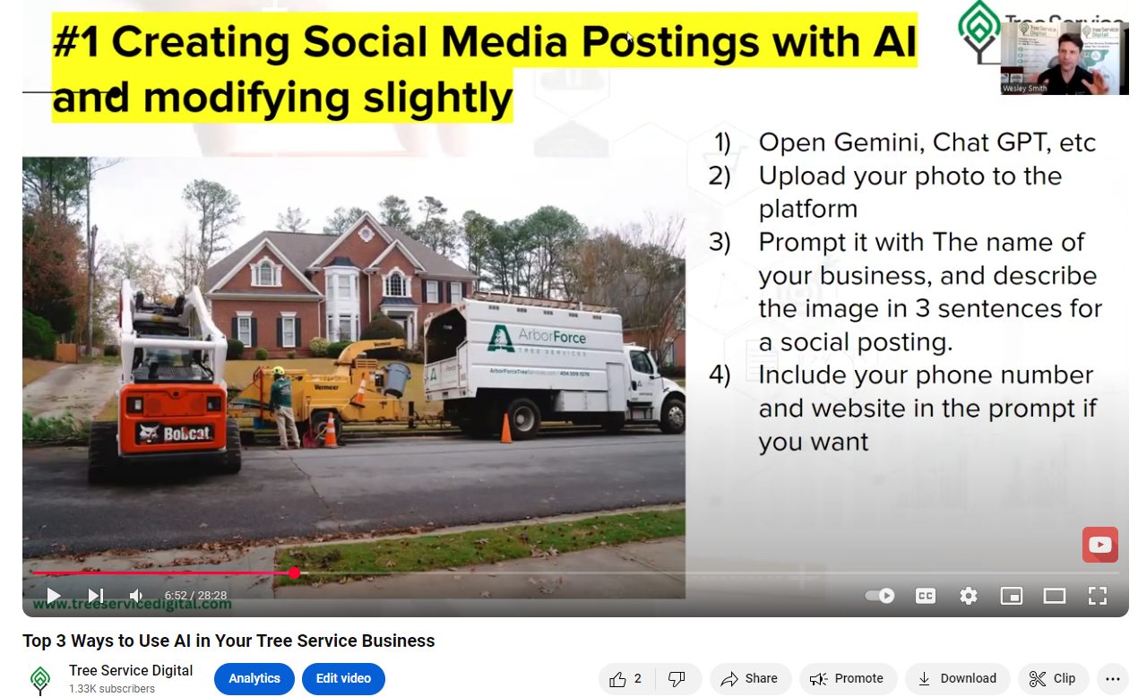 , I sent you an email earlier this week with the replay link for the The Top 3 Ways to use AI in your Tree Service business that we did. CRITICAL NOTE: *If you're strapped for time and can't watch the whole replay, we wanted to let you know about the one thing we revealed on the webinar you simply shouldn't miss: *At **MINUTE 6:50** I revealed how to get social media postings done quickly and easily with the use of Chat GPT. It's been said that this one single "cool secret" was worth the whole webinar... so I wanted to make sure if you couldn't watch anything else on the webinar replay, you didn't miss that one part! :-) | | | | | | | | | Have a Great Day and Prosperous New Year!! | | | | | | | Sent to: ateebhassan000.ravian@blogger.com EclipseLocal Web Consulting, 1185 Hightower Trail #501673, Atlanta, GA 30350, United States | | | | | | |