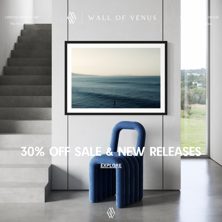 TUESDAY, MAY 20, 2025 | ISSUE 25.49 | | 30% OFF SPRING REFRESH SALE A fresh season calls for a fresh perspective. Our 30% OFF Spring Refresh Sale is your invitation to transform your home with limited edition fine art that evokes feeling, sparks inspiration, and turns everyday spaces into extraordinary ones. Now is the time to surround yourself with art that reflects the beauty, energy, and elegance you want to feel every day. Refresh your space. Refresh your spirit. Get yours before it's sold or before the sale ends. 30% off is taken off automatically at checkout. | | New Release "Hidden Gems" by Lorenzo Marzola | | A Collector's Review "Absolutely stoked on the piece. Thank you so much for your responsiveness and most importantly--all the art you're pushing out to the community." - EDP | | What Are We STAYING UP ON? KITH NEW RELEASE Lexus unveils the 2025 IS 500 Ultimate Edition, a limited-run V8 sports sedan capped at 500 units. Featuring BBS forged wheels and exclusive detailing, it celebrates performance and craftsmanship in true luxury style. | | | | What Are WE LISTENING TO? Gallery Playlist This is what we have playing at the gallery. Go ahead and take a listen. | | | | New Canvas Art Release: "Veil of Heat" | | Elevate Your Space, Elevate Your Life Art breathes meaning and life into our spaces, it's a reflection of who we are, a daily source of inspiration. It captures the beauty of the world and reminds us of the stories worth telling. | | Wall of Venus. 869 East 2500 South, #314 Salt Lake City, UT, 84107 | | | | |