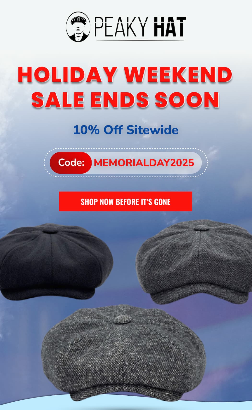 Made to Mean Something Peaky Hat is more than a look—it's a story you wear. Inspired by heritage, designed for the present, and built to last, every hat we create carries character, craftsmanship, and connection. From premium materials to signature silhouettes, each piece is made with intention—to elevate your everyday, mark a moment, or honor a memory. Whether you're starting a new tradition or living out an old soul's dream, Peaky Hat is where classic spirit meets personal style. Promotional Terms & Conditions All promotional offers are available for a limited time only, as noted. Offers cannot be combined with other discounts or applied to past purchases. Promotions hold no cash value and cannot be exchanged for cash or credit. Items marked Final Sale are not eligible for return, refund, or exchange. All returns and exchanges must comply with Peaky Hat's standard return policy. We reserve the right to update or withdraw promotions at any time without prior notice. Availability and pricing are subject to change based on inventory or other unforeseen circumstances. Peaky Hat | 5806 West War Memorial Drive, Unit B, Peoria, Illinois 61615 You're receiving this email because you opted in for updates, offers, and curated experiences from Peaky Hat. | | Made to Mean Something Peaky Hat is more than a look—it's a story you wear. Inspired by heritage, designed for the present, and built to last, every hat we create carries character, craftsmanship, and connection. From premium materials to signature silhouettes, each piece is made with intention—to elevate your everyday, mark a moment, or honor a memory. Whether you're starting a new tradition or living out an old soul's dream, Peaky Hat is where classic spirit meets personal style. Promotional Terms & Conditions All promotional offers are available for a limited time only, as noted. Offers cannot be combined with other discounts or applied to past purchases. Promotions hold no cash value and cannot be exchanged for cash or credit. Items marked Final Sale are not eligible for return, refund, or exchange. All returns and exchanges must comply with Peaky Hat's standard return policy. We reserve the right to update or withdraw promotions at any time without prior notice. Availability and pricing are subject to change based on inventory or other unforeseen circumstances. Peaky Hat | 5806 West War Memorial Drive, Unit B, Peoria, Illinois 61615 You're receiving this email because you opted in for updates, offers, and curated experiences from Peaky Hat.