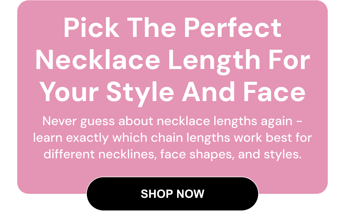 | Face shapes, necklines & layering rules | | | | | | | | | | | | Measure Like A Pro | | | | Use a soft measuring tape around your neck, add 2-4 inches for comfort - this becomes your base length for everyday necklaces. | | | | | | | | | | | | | | | | | | Face Shape Matters | | | | Round faces look best with longer chains (20-24 inches), while heart-shaped faces shine with shorter necklaces (16-18 inches). | | | | | | | | | | | | | | | | Neckline Matching | | | | Choose 16-inch chains for high necklines, 18-20 inches for V-necks, and 22-24 inches for turtlenecks or high collars. | | | | | | | | | | | | | | | | Layering Rules | | | | Start with a 16-inch base necklace, then add pieces 2-4 inches longer for each layer to prevent tangling. | | | | | | | | | | | | | | | | | | Body Type Guide | | | | Petite frames suit 16-18 inch chains, while taller heights can carry longer lengths up to 24 inches beautifully. | | | | | | | | | | | | Find your perfect necklace length and start wearing your pieces with confidence. | | | | | | | | | | | | | | Over 10,000+ Happy Customers | | | | | | | | | | | | | | | | | | | | Shop With Confidence | | | | | | | | | Let's Connect: 818-882-9030 | | | | | | | | | If you'd no longer like to receive emails, Unsubscribe. | | | | | | | | | | | | | You're receiving this email because you you subscribed or recently purchased from Alef Bet Jewelry by Paula. | | | | Our mailing address is: P.O. Box 3974 Los Angeles, California 91313 | | | | | | | | | |
