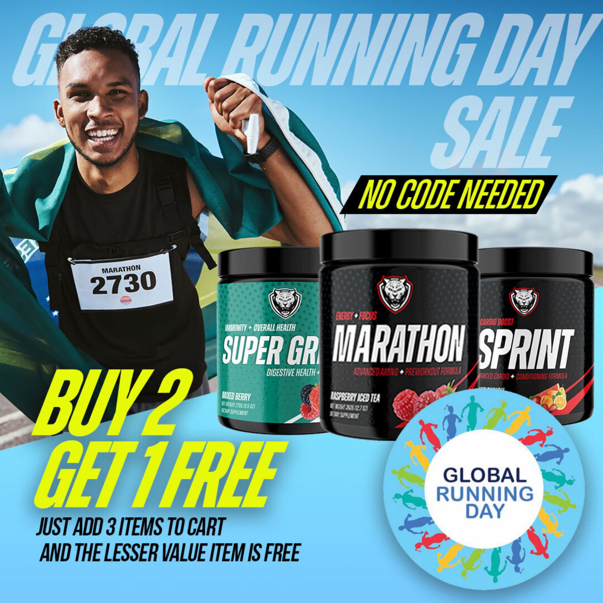 From now, through the final seconds after Global Running Day, enjoy Buy Two, Get One FREE on ALL of our award-winning formulas! That's right — every product in our lineup is included.
