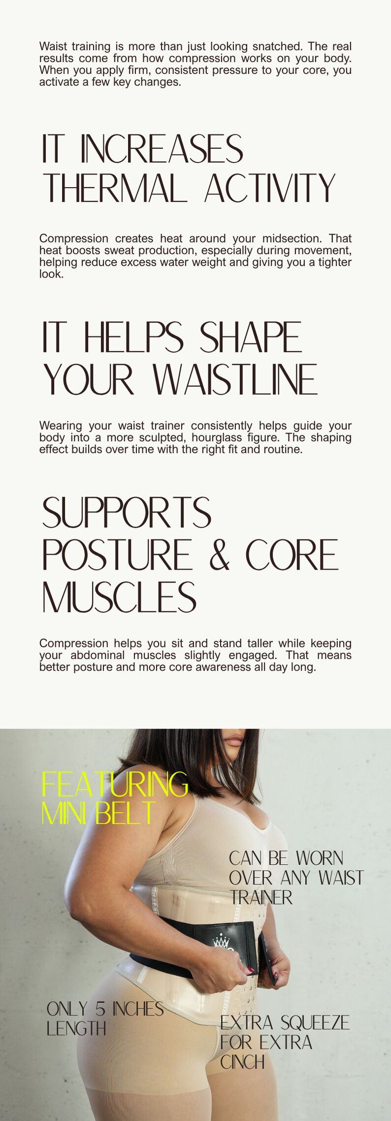 Perfect for women serious about waist training, posture improvement, and dramatic, visible curves. | | | | | Ready to sculpt your waist and turn up the heat? The Squeez Me Skinny Everyday Workout Waist Trainer is built for movement, sweat, and all-day comfort. Whether you're powering through a workout or running errands, this trainer boosts thermal activity, supports posture, and helps slim your waistline instantly and over time.