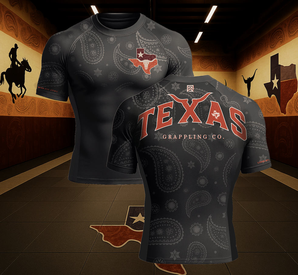 The Texas Grappler Rashguard ON SALE NOW! | | WHETHER YOU'RE AN OUTLAW, A RANGER, OR A COWBOY ON THE MATS, FIGHT LIKE YOU MEAN IT. This is combat gear for grapplers built by heat, pressure, and tradition. Made for those who grind through rounds like saddle leather, and don't back down when the mat gets rough. -