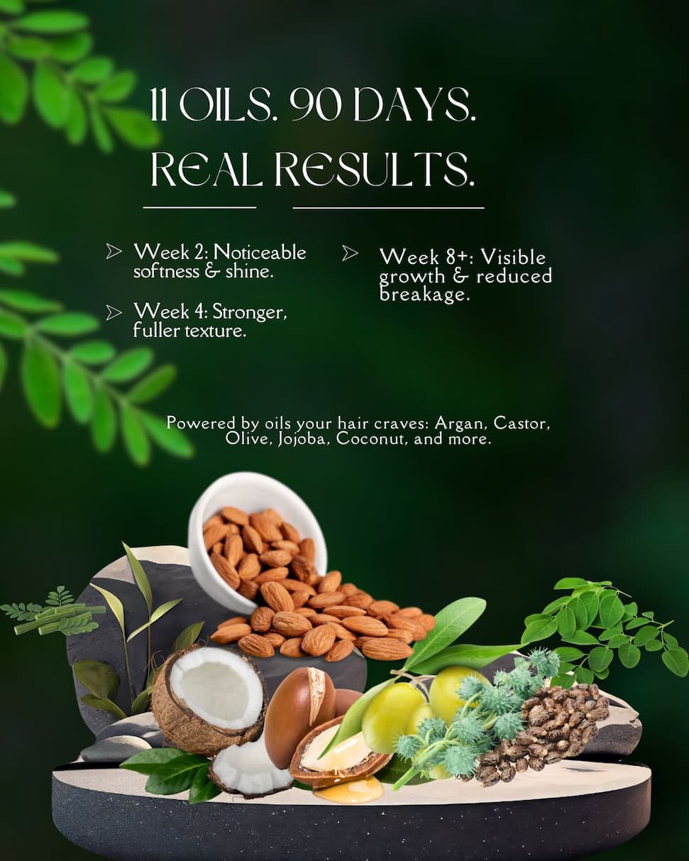 In the first few days, nourishment begins as your scalp absorbs the rich blend of 11 natural oils. By week two, you'll notice less breakage and a smoother texture. By week four, strands start to feel fuller and stronger. And between weeks eight to twelve, visible growth becomes your new normal. It's a slow build, but the transformation is real. | | | | |
