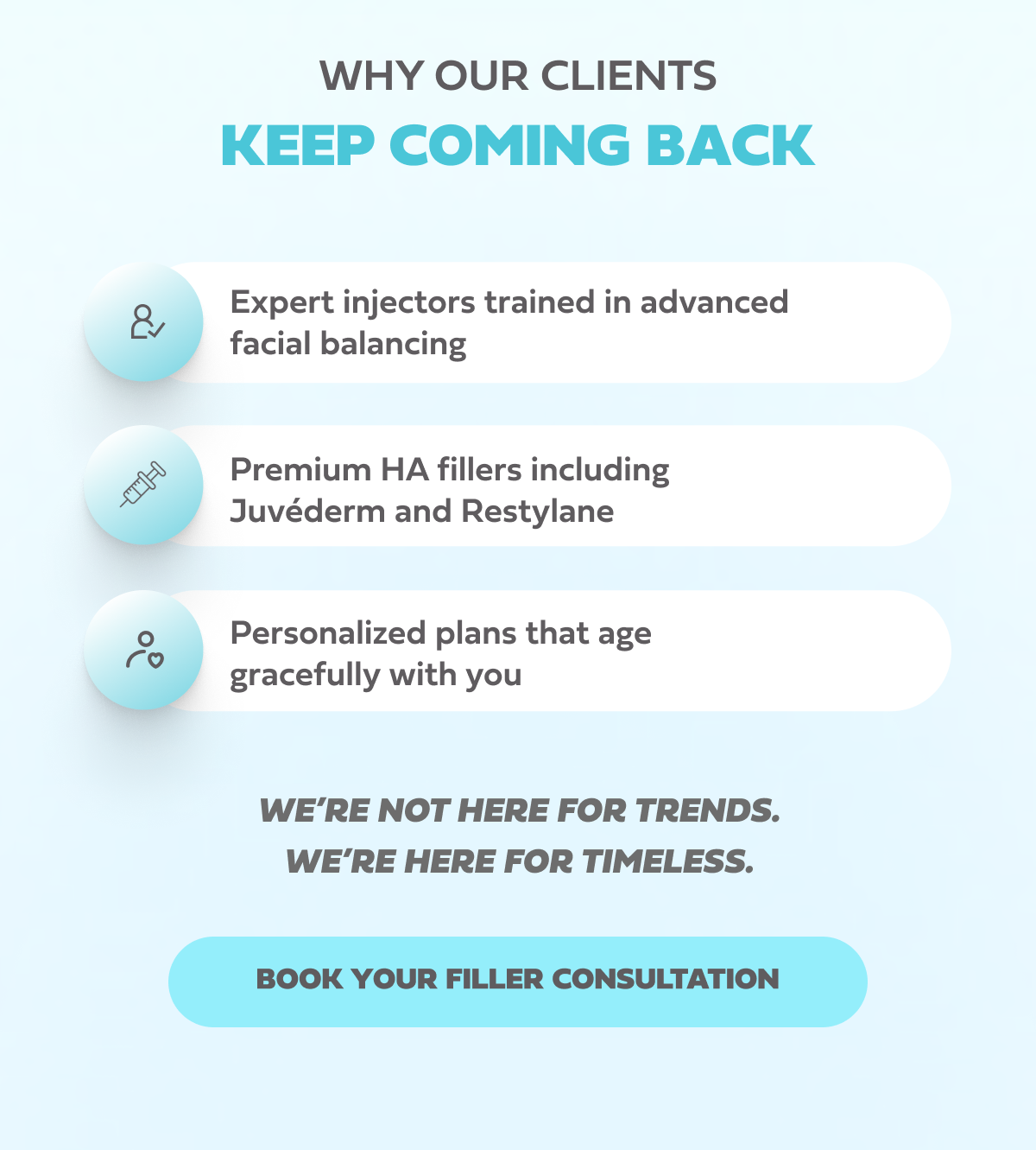 Subtle, sculpted, and undeniably you. We believe filler should enhance what's already there, never overpower it.