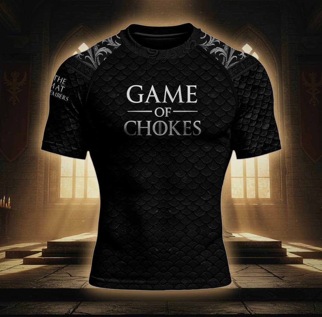 Game of Choke Rashguard ON SALE NOW | | Game of Chokes BJJ Rashguard – Rule the Mats Enter the Game of Chokes, where only the skilled survive. Designed for warriors of the mats, this high-performance rashguard is built for durability, mobility, and style. Whether you're drilling techniques or battling in live rolls, the Game of Chokes rashguard offers unmatched comfort with moisture-wicking, four-way stretch fabric that keeps you cool under pressure. With fully sublimated graphics that won't fade, peel, or crack—this rashguard is as tough as your training sessions. Flatlock stitching prevents chafing, and the compression fit supports muscle recovery and performance. Features: -