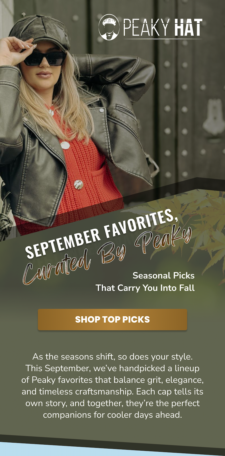 Made to Mean Something Peaky Hat is more than a look—it's a story you wear. Inspired by heritage, designed for the present, and built to last, every hat we create carries character, craftsmanship, and connection. From premium materials to signature silhouettes, each piece is made with intention—to elevate your everyday, mark a moment, or honor a memory. Whether you're starting a new tradition or living out an old soul's dream, Peaky Hat is where classic spirit meets personal style. Promotional Terms & Conditions All promotional offers are available for a limited time only, as noted. Offers cannot be combined with other discounts or applied to past purchases. Promotions hold no cash value and cannot be exchanged for cash or credit. Items marked Final Sale are not eligible for return, refund, or exchange. All returns and exchanges must comply with Peaky Hat's standard return policy. We reserve the right to update or withdraw promotions at any time without prior notice. Availability and pricing are subject to change based on inventory or other unforeseen circumstances. Peaky Hat | 5806 West War Memorial Drive, Unit B, Peoria, Illinois 61615 You're receiving this email because you opted in for updates, offers, and curated experiences from Peaky Hat. | | Made to Mean Something Peaky Hat is more than a look—it's a story you wear. Inspired by heritage, designed for the present, and built to last, every hat we create carries character, craftsmanship, and connection. From premium materials to signature silhouettes, each piece is made with intention—to elevate your everyday, mark a moment, or honor a memory. Whether you're starting a new tradition or living out an old soul's dream, Peaky Hat is where classic spirit meets personal style. Promotional Terms & Conditions All promotional offers are available for a limited time only, as noted. Offers cannot be combined with other discounts or applied to past purchases. Promotions hold no cash value and cannot be exchanged for cash or credit. Items marked Final Sale are not eligible for return, refund, or exchange. All returns and exchanges must comply with Peaky Hat's standard return policy. We reserve the right to update or withdraw promotions at any time without prior notice. Availability and pricing are subject to change based on inventory or other unforeseen circumstances. Peaky Hat | 5806 West War Memorial Drive, Unit B, Peoria, Illinois 61615 You're receiving this email because you opted in for updates, offers, and curated experiences from Peaky Hat.