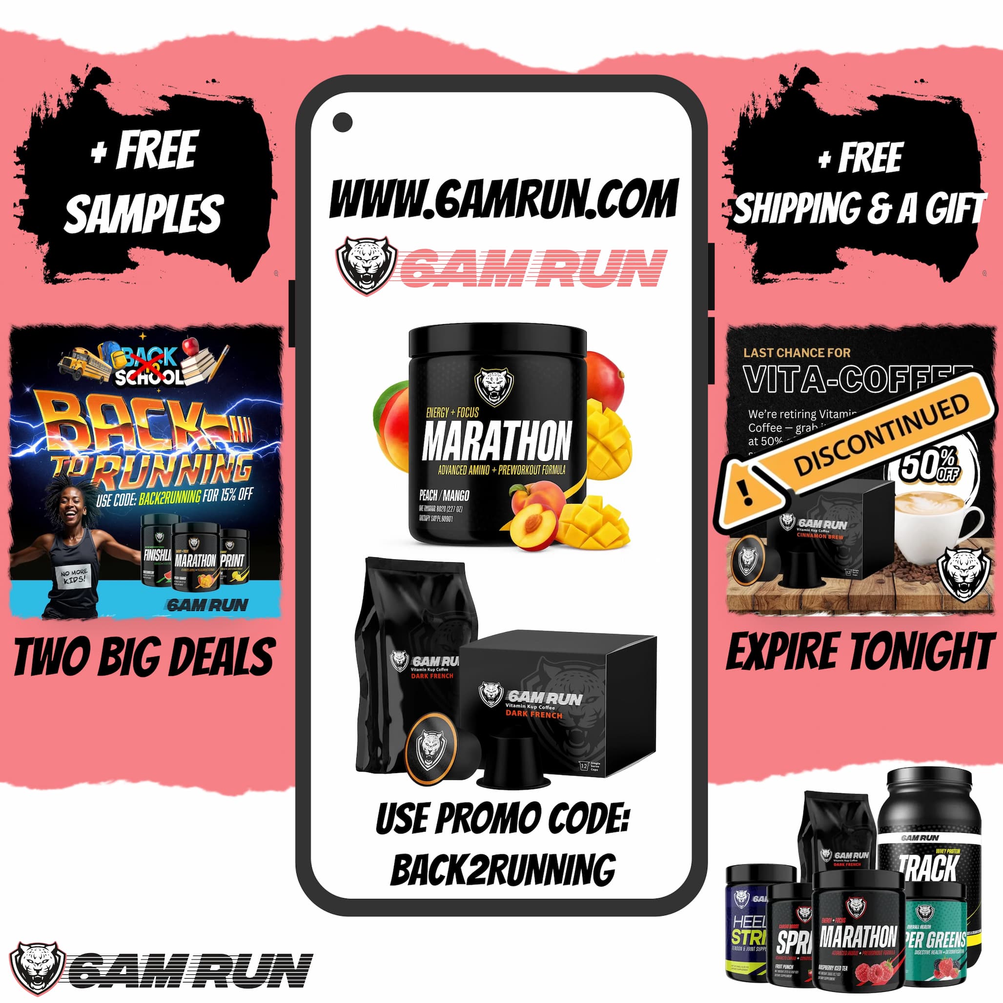 Back to school RUNNING! & 6AMRun Vita Coffee is ALMOST GONE 4 GOOD! | | TIME is RUNNING Out! We're reaching out with two urgent announcements that you don't want to miss! One, is our "Back to Running" Sale! 🌟 Kickstart your marathon season training with our exclusive Back to Running Sale! Use promo code: Back2Running at checkout. Fall is the peak time for running, and our formulas are designed to support and enhance your performance. Second, is this is our Final Call for 6AMRun Vita-Coffee ☕️ Our beloved Vitamin Coffee is almost sold out, and this is your last chance to grab it. Once it's gone, it's gone for good. Don't miss your opportunity to enjoy this unique blend that fueled many of your morning runs. Act fast! Stock is limited, and both offers end soon. Visit 6AMRun.com now to secure your products before they're gone! Thank you for being part of the 6AM Run community. Let's make this marathon season the best yet! | | The ultimate runner's bundle, built to fuel every step of your run. | | | | |
