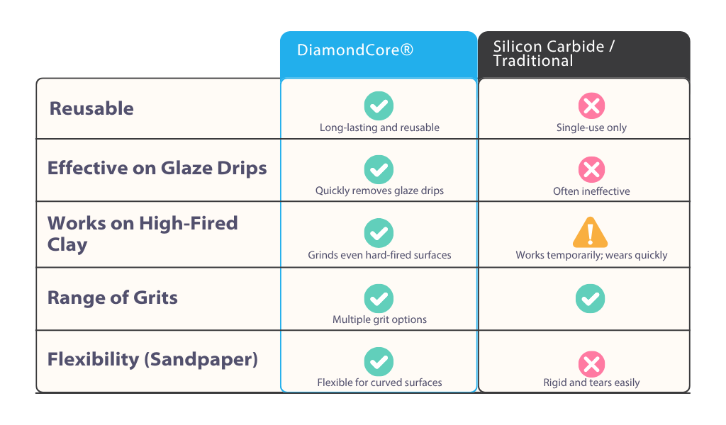 When it comes to finishing your pieces, the right sanding and grinding products make all the difference. DiamondCore® sanding and grinding tools are designed to give you flawless surfaces with less effort whether you're refining clay, smoothing glaze drips, or polishing to a shine. | | | | Why DiamondCore® Wins in the Studio