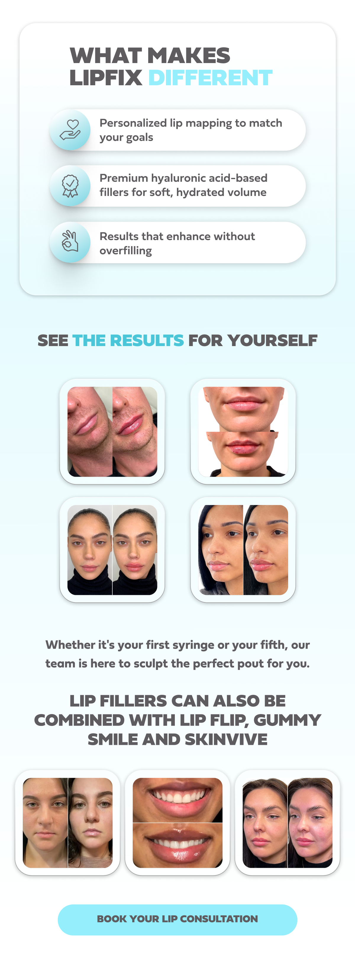 LipFix is designed for natural, hydrated volume, whether you're after subtle definition, added fullness, or youthful structure. Our expert injectors work with your unique anatomy to deliver a refreshed look that still feels like you. | | | | |