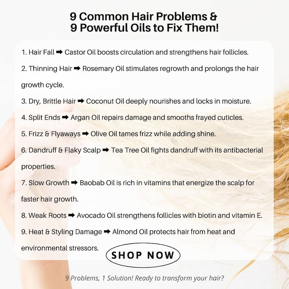 ALL THE GOODNESS OF 9 OILS IN JUST 1 BOTTLE | | Why juggle multiple products when your hair deserves one powerful solution? Our formula brings together 9 nature-sourced oils, each chosen for their unique benefits: hydration, shine, strength, scalp balance, and growth support. | | | | |