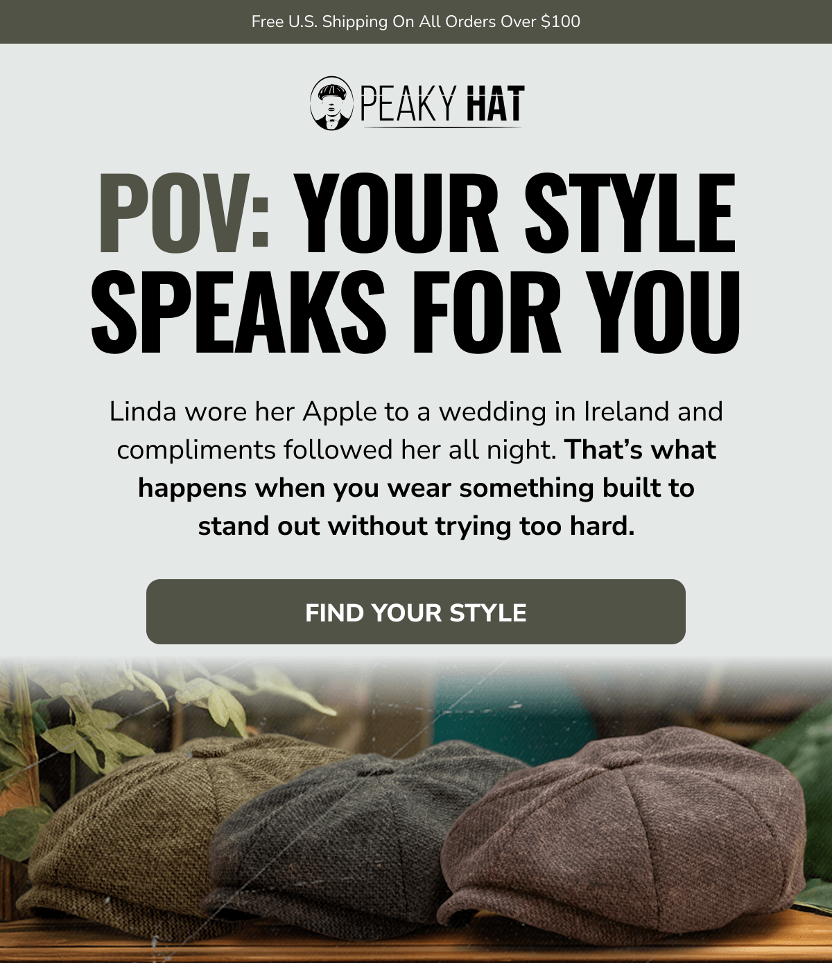 Made to Mean Something: Peaky Hat is more than a look - it's a story you wear. Inspired by heritage, designed for the present, and built to last, every hat we create carries character, craftsmanship, and connection. From premium materials to signature silhouettes, each piece is made with intention - to elevate your everyday, mark a moment, or honor a memory. Whether you're starting a new tradition or living out an old soul's dream, Peaky Hat is where classic spirit meets personal style. Promotional Terms & Conditions: All promotional offers are available for a limited time only, as noted. Offers cannot be combined with other discounts or applied to past purchases. Promotions hold no cash value and cannot be exchanged for cash or credit. Items marked Final Sale are not eligible for return, refund, or exchange. All returns and exchanges must comply with Peaky Hat's standard return policy. We reserve the right to update or withdraw promotions at any time without prior notice. Availability and pricing are subject to change based on inventory or other unforeseen circumstances. Peaky Hat | 5806 West War Memorial Drive, Unit B, Peoria, Illinois 61615 You're receiving this email because you opted in for updates, offers, and curated experiences from Peaky Hat. No longer want to receive these emails? Unsubscribe. | | | | |