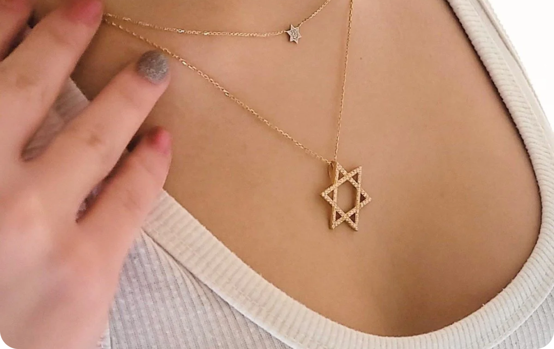 | Touch your spiritual piece to set intention  |  |  | | | | |  | | Morning Ritual Power | | Start each day by touching your spiritual piece while setting your intention - making it a physical anchor for your daily affirmations. | | | |  | | | | | | |  | | Mindful Moments | | Let your Jewish star necklace remind you to pause, breathe, and reconnect with your faith throughout busy days. | | | | | | | | |  | | Symbol Connection | | Each symbol can reinforce specific affirmations - Chai for vitality, Hamsa for protection, helping you stay focused on your daily intentions. | | | | | | | | |  | | Physical Reminders | | When you feel your jewelry against your skin, use it as a cue to repeat your chosen affirmation and reset your mindset. | | | |  | | | | | | |  | | Evening Reflection | | End your day by holding your piece, reflecting on how it helped maintain your focus and strengthen your spiritual connection. | | | | | | | | | Turn your spiritual jewelry into more than just accessories - make them daily tools for growth and mindfulness. | | | | | | | | | | Over 10,000+ Happy Customers | | | |