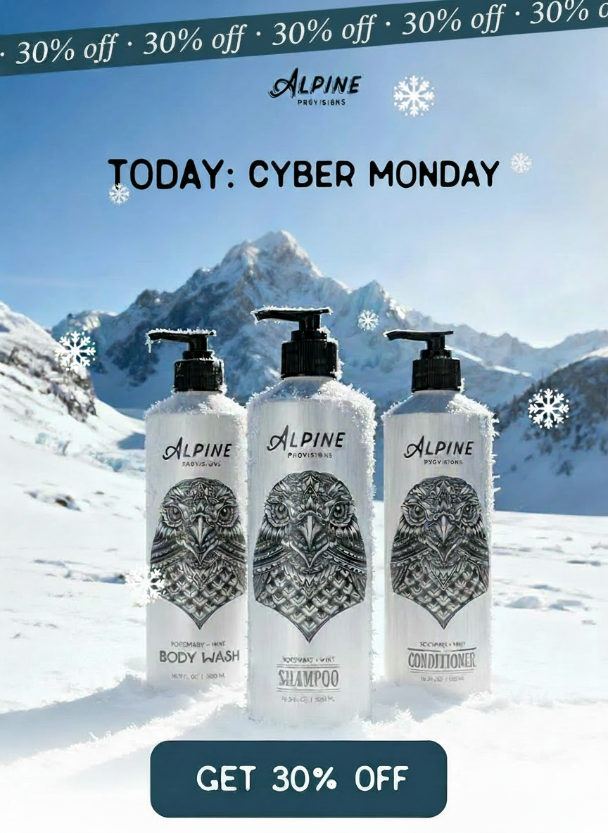 Today only: Cyber Monday! Enjoy 30% Off everything at Alpine Provisions. Treat yourself to premium, nature-inspired body and hair care. And your loved ones too. But hurry, this offer ends at midnight.