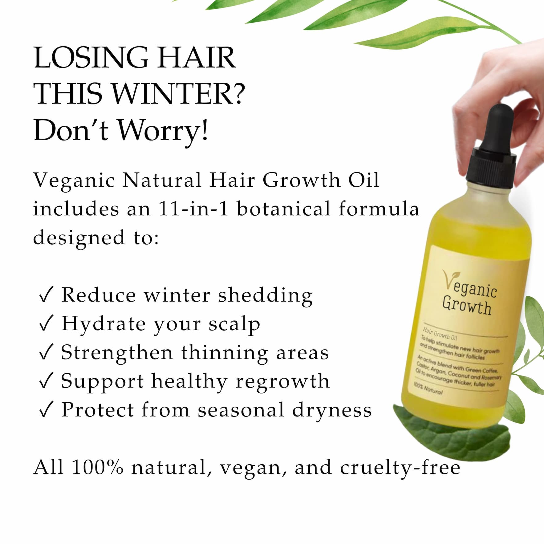 Why Winter Causes More Shedding?? Dry scalp = irritated follicles Indoor heat = dehydrated strands Temperature changes = stress on the hair root Hats, scarves & friction = breakage If you're noticing extra hair in the shower or on your brush… it's completely normal this time of year. | | Veganic Growth has a complete natural solution to winter shedding, dry scalp & thinning hair. | | | | |