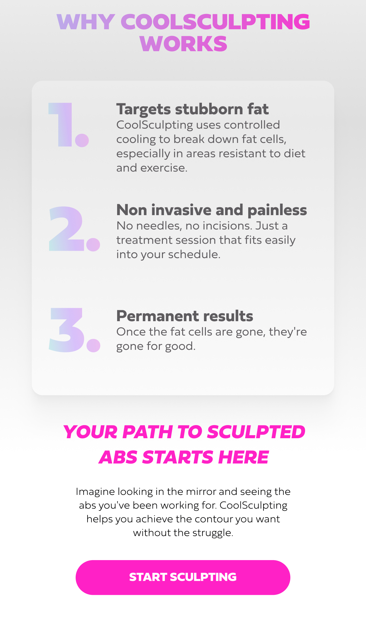 Hi beautiful, You've tried it all: strict diets, gym memberships, endless crunches. Yet, that stubborn fat around your abs just won't budge. Sound familiar? Say hello to CoolSculpting for Abs, the non invasive solution that targets and freezes away stubborn fat for good. No surgery, no downtime, just results.