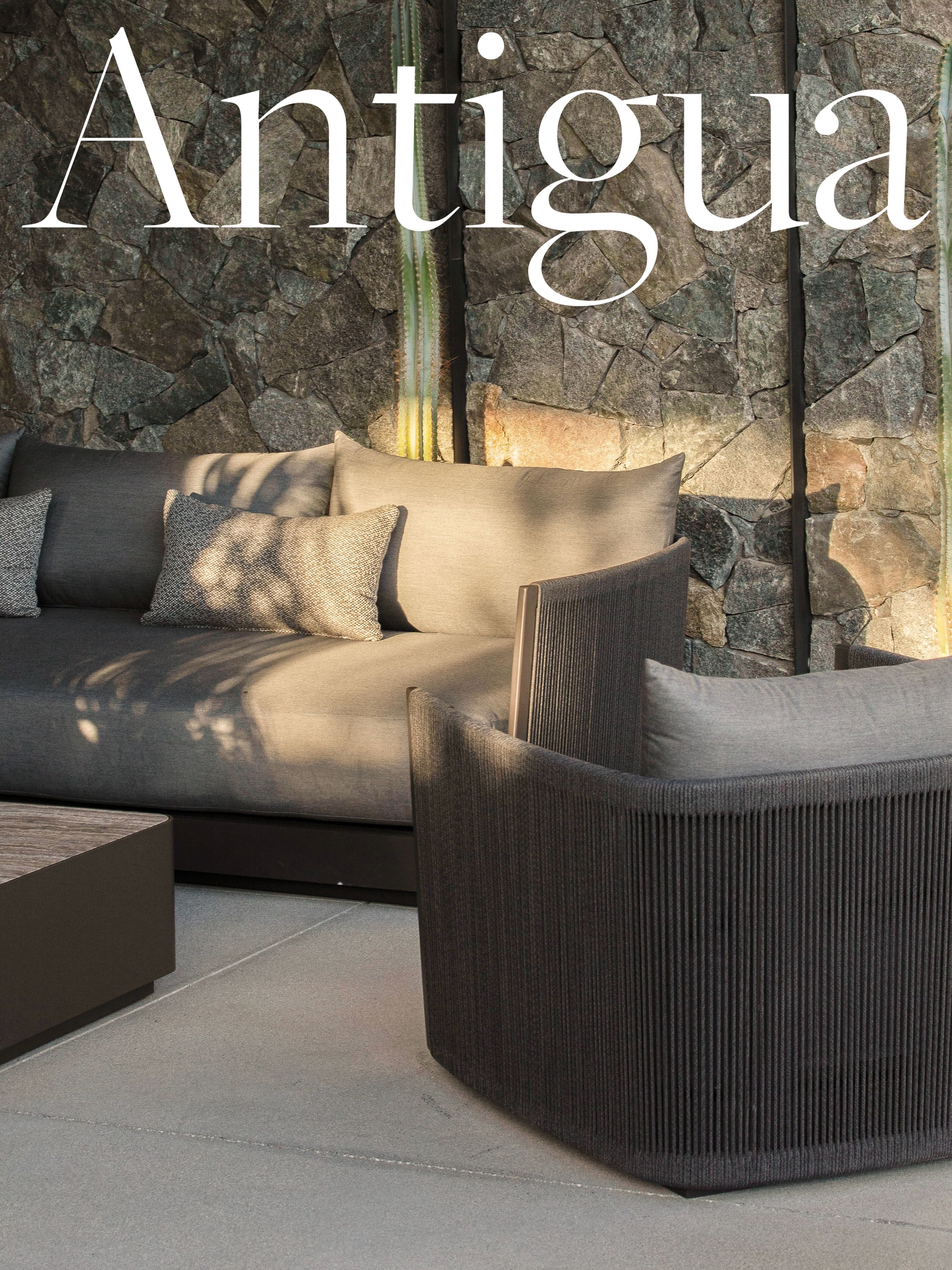 A contemporary expression of European styling and subtle design. Understated curves and a sleek new vision of rope create a natural play between light and shadow. | | Made from lightweight, rust-resistant aluminum, Antigua is built to endure the elements. Quick-dry cushions offer sink-in comfort, upholstered in a range of performance fabrics that resist sun, moisture, mildew, and stains. | | | | |