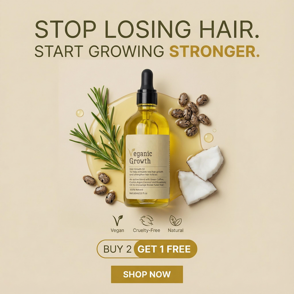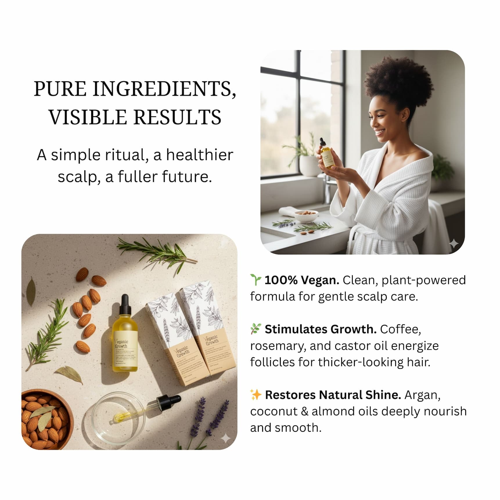 Intensive Scalp Hydration Powered by Botanical Oils You deserve hair care that strengthens from the roots, restores softness, and respects your scalp. Veganic Growth Oil combines 11 botanical oils chosen for their proven ability to revive thinning hair, boost circulation, and support fuller, healthier strands, naturally. No fillers. No harsh chemicals. Just clean, active nutrients your scalp will love. | | 72 Days of Care. Visible Difference. Hydrates • Strengthens • Nourishes | | | | |