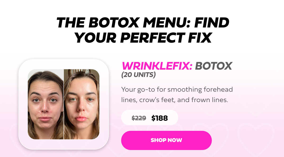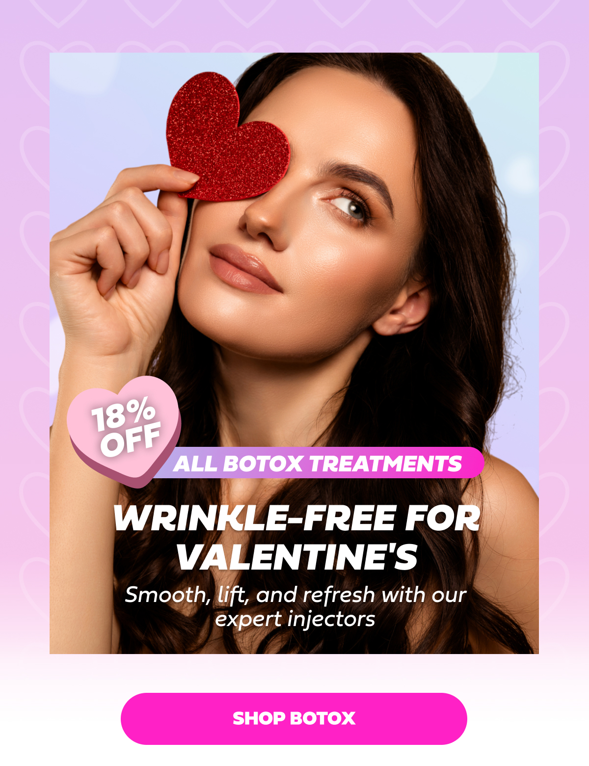 Hi beautiful, Want to look refreshed, rested, and ready for anything this Valentine's? Our Botox treatments are 18% off and there's never been a better time to smooth away those expression lines. Whether it's your forehead, crow's feet, or that perfect brow lift you've been wanting, our expert injectors will have you looking naturally flawless.