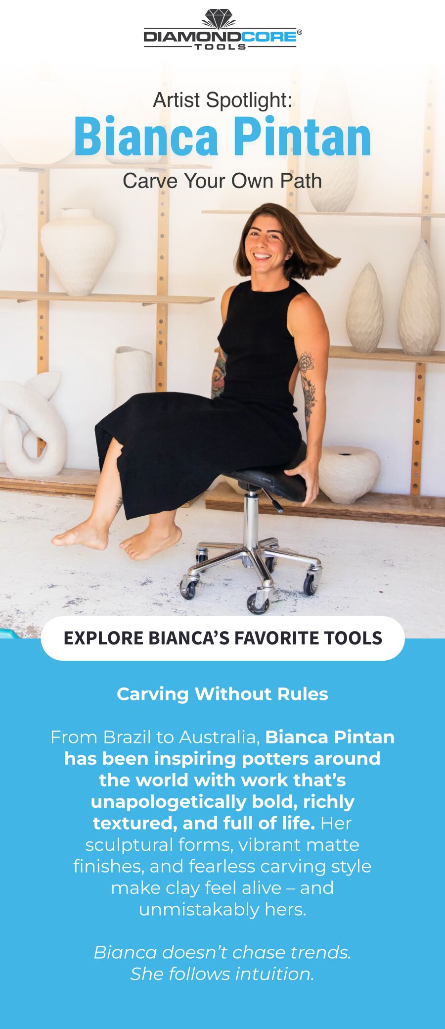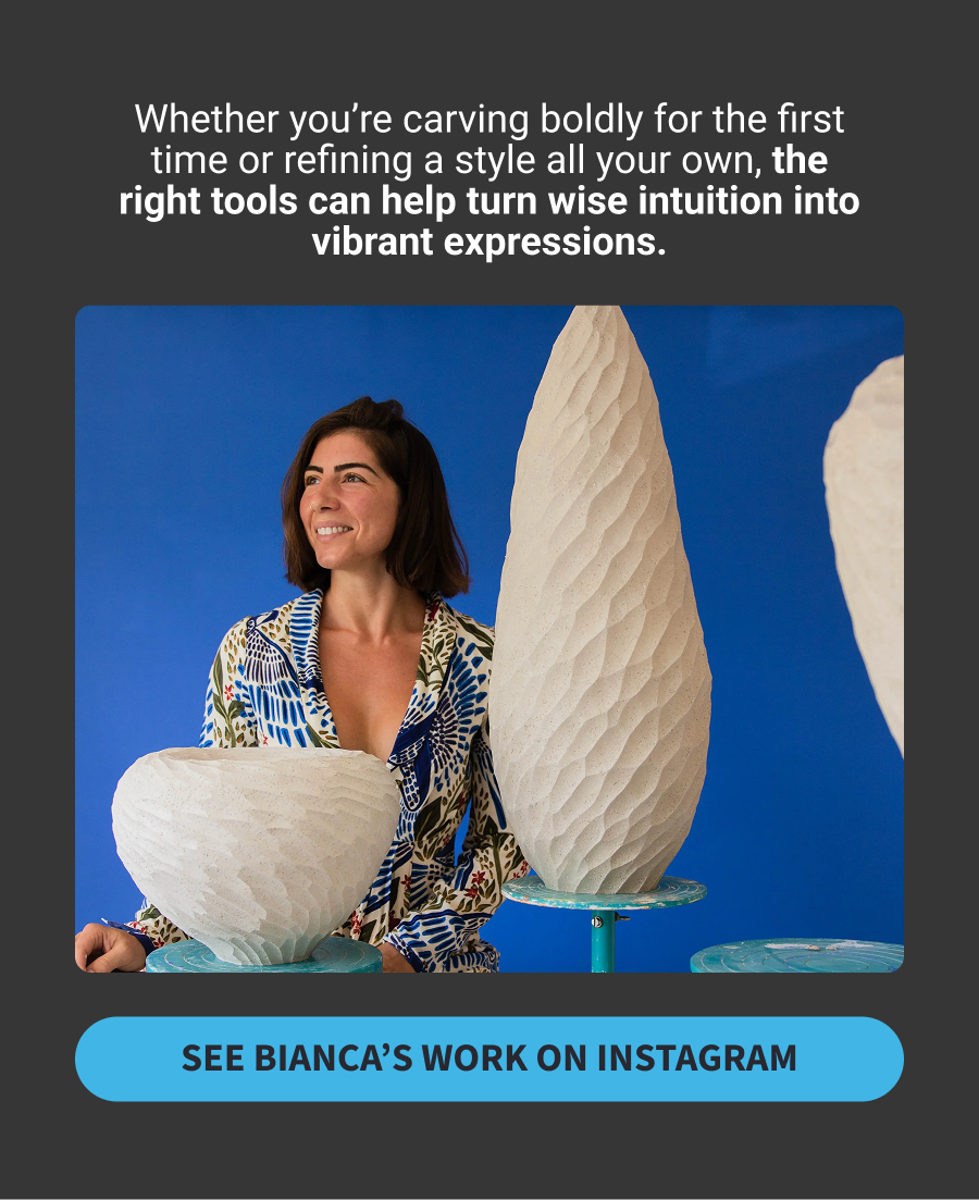 Bold carving, fearless color, and the tools she trusts.