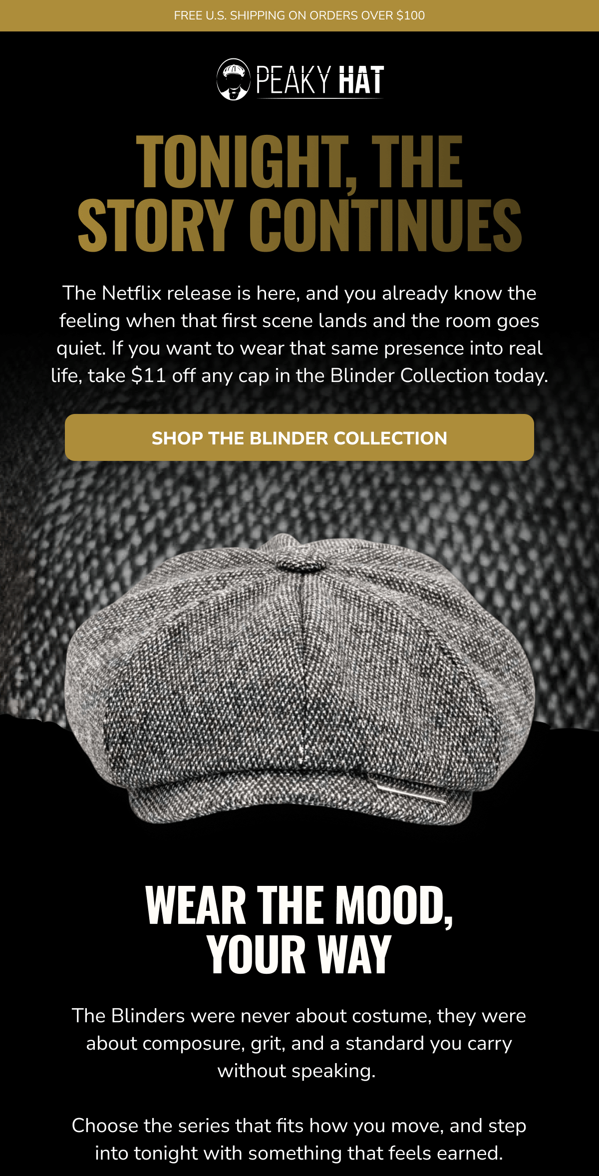 Made to Mean Something: Peaky Hat is more than a look - it's a story you wear. Inspired by heritage, designed for the present, and built to last, every hat we create carries character, craftsmanship, and connection. From premium materials to signature silhouettes, each piece is made with intention - to elevate your everyday, mark a moment, or honor a memory. Whether you're starting a new tradition or living out an old soul's dream, Peaky Hat is where classic spirit meets personal style. Promotional Terms & Conditions: All promotional offers are available for a limited time only, as noted. Offers cannot be combined with other discounts or applied to past purchases. Promotions hold no cash value and cannot be exchanged for cash or credit. Items marked Final Sale are not eligible for return, refund, or exchange. All returns and exchanges must comply with Peaky Hat's standard return policy. We reserve the right to update or withdraw promotions at any time without prior notice. Availability and pricing are subject to change based on inventory or other unforeseen circumstances. Peaky Hat | 5806 West War Memorial Drive, Unit B, Peoria, Illinois 61615 You're receiving this email because you opted in for updates, offers, and curated experiences from Peaky Hat. No longer want to receive these emails? Unsubscribe. | | | | |